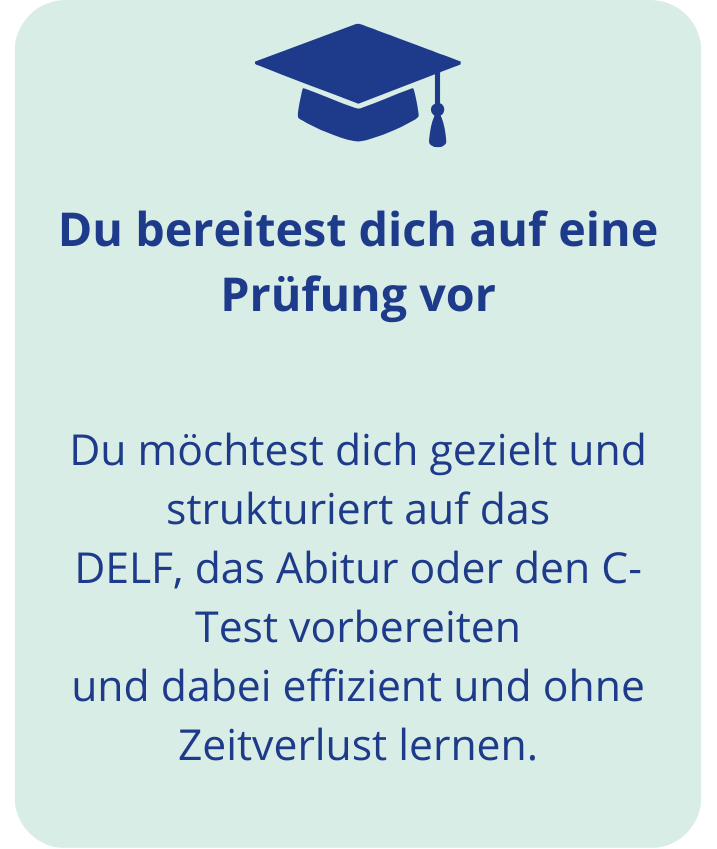 spezialisiert auf Prüfungsvorbereitung (DELF, Abitur, C-Test) und Französisch für den Beruf – mit einer muttersprachlichen Lehrerin.