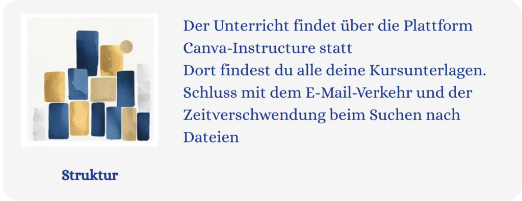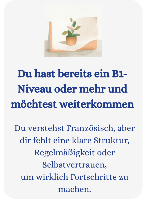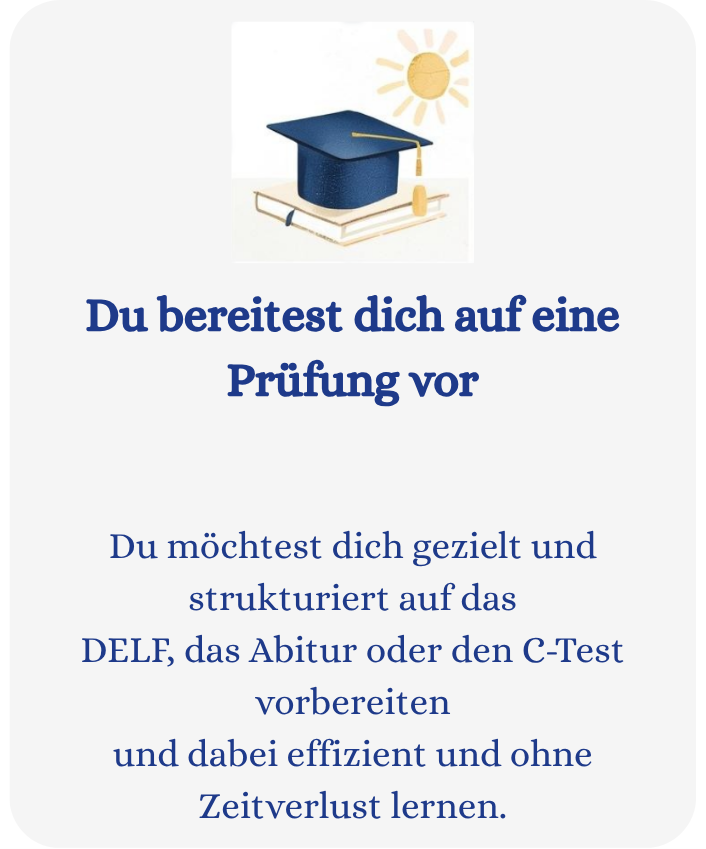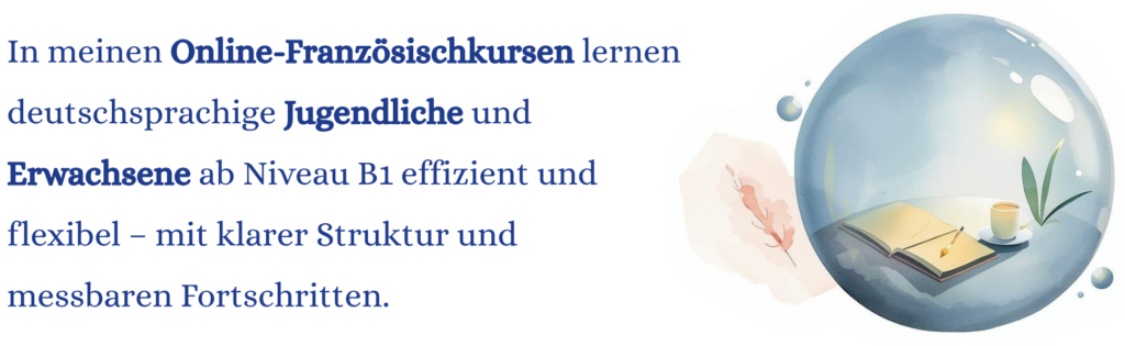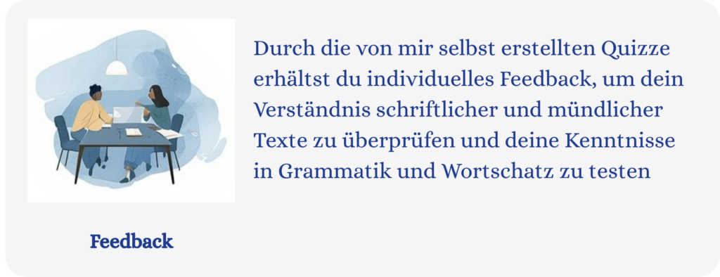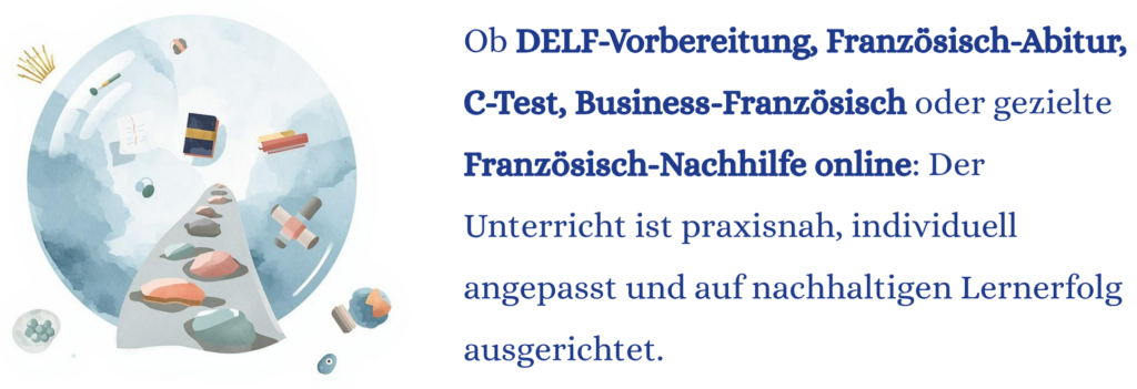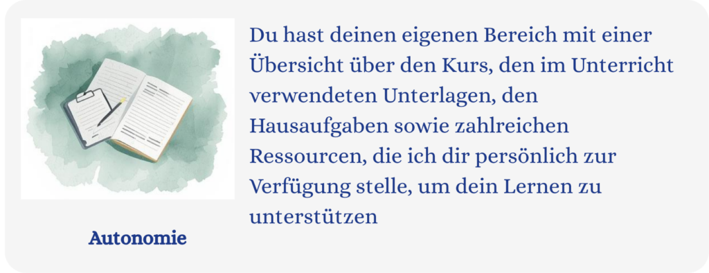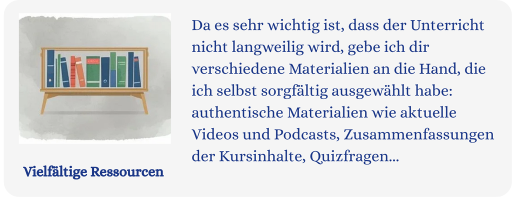 Bei Julie kann ich persönlich oder online lernen, je nachdem, wie es in meinen vollen Terminkalender unterzubringen ist. Außerdem können wir so die Lerninhalte zu 100% auf meinen Bedarf einstellen, nämlich Kommunikation in Person und ein Sprachrepertoire in allem, was einem auf Reisen begegnet. Ich strebe kein bestimmtes Niveau an, daher ist für mich die Grammatik weniger wichtig sondern mehr das Sprechen und das Lernen durch das Benutzen der Sprache.