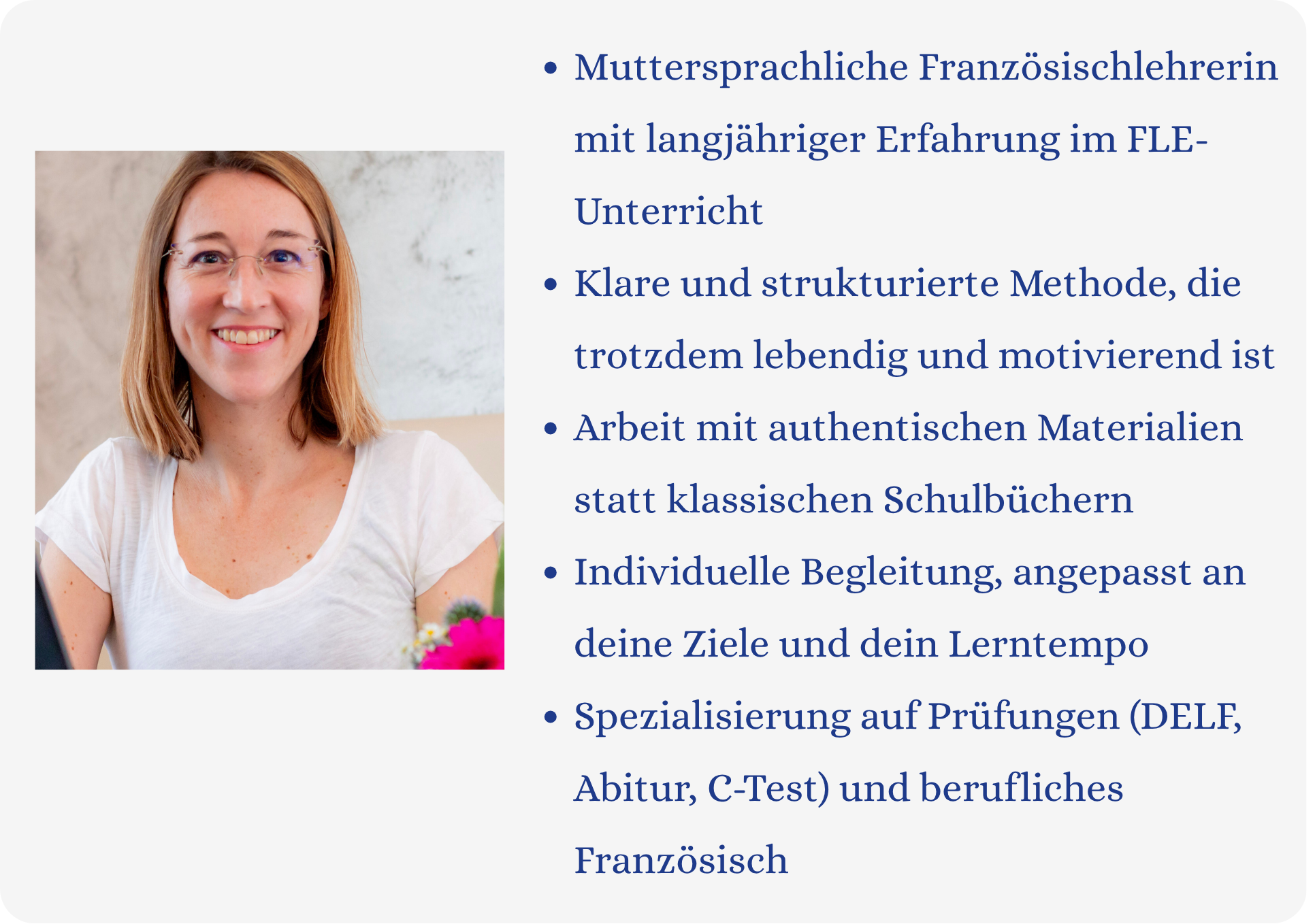 Muttersprachliche Französischlehrerin mit langjähriger Erfahrung im FLE-Unterricht