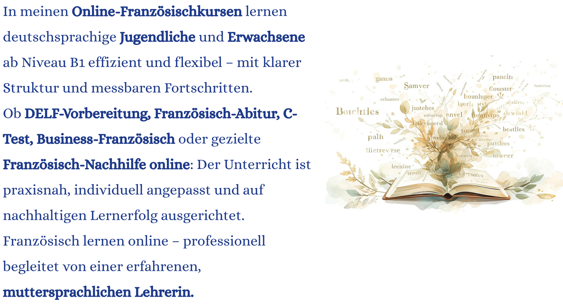 Ob DELF-Vorbereitung, Französisch-Abitur, C-Test, Business-Französisch oder gezielte Französisch-Nachhilfe online: Der Unterricht ist praxisnah, individuell angepasst und auf nachhaltigen Lernerfolg ausgerichtet.