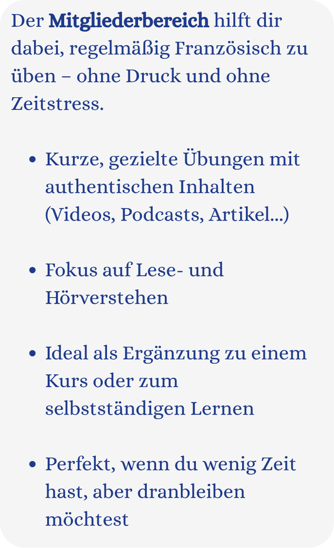 Der Mitgliederbereich hilft dir dabei, regelmäßig Französisch zu üben – ohne Druck und ohne Zeitstress.